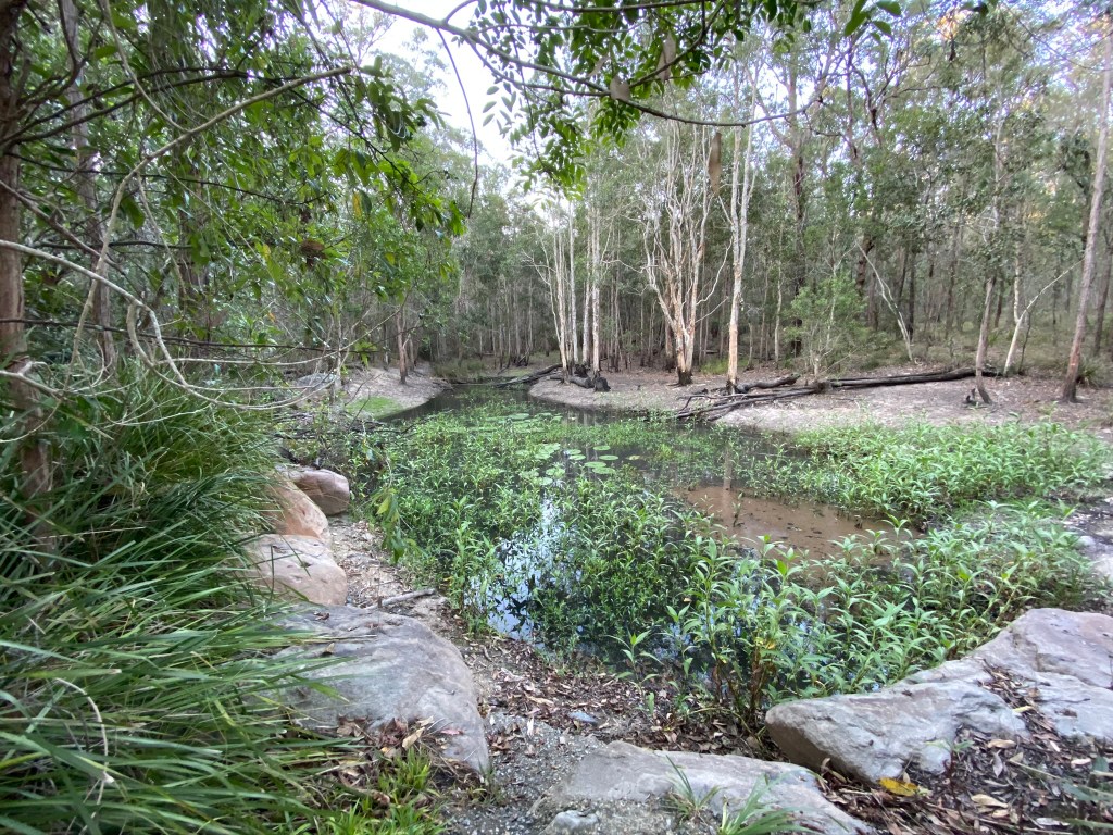 To the south-west (bottom left of the map) is what eBird calls Toohey Forest’s “western tracks”. The main paths here are the Hibertia and Wilcox tracks, though again there are a few unofficial but obvious narrower tracks branching off (one of which leads down into a boulder-strewn creek bed). Near the piece of track linking Hibertia and Nathan Ridge (not sure what its official designation is) lies a waterhole, the main drinking spot when the creeks dry up (as they inevitably seem to do).