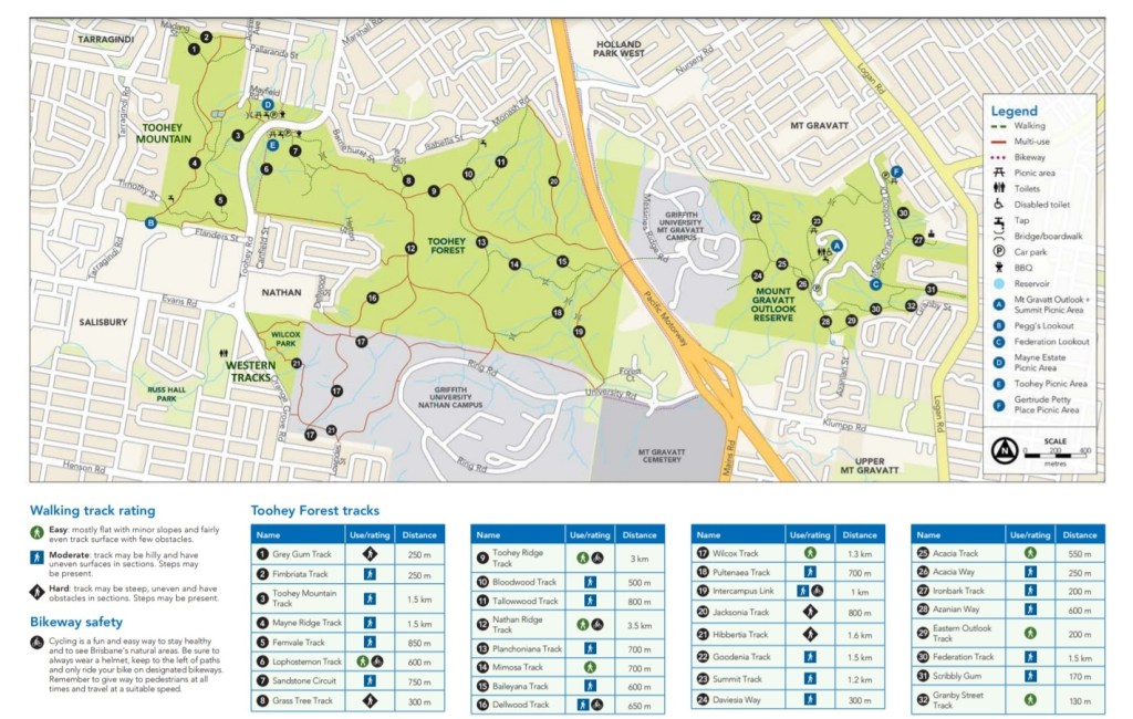 Toohey Forest is a fairly large tract (260 hectares) of bushland in Tarragindi, around 10km from Brisbane CBD. Theres a few different types of track to enjoy, and when taken together these tracks encompass all of the sections of the forest.