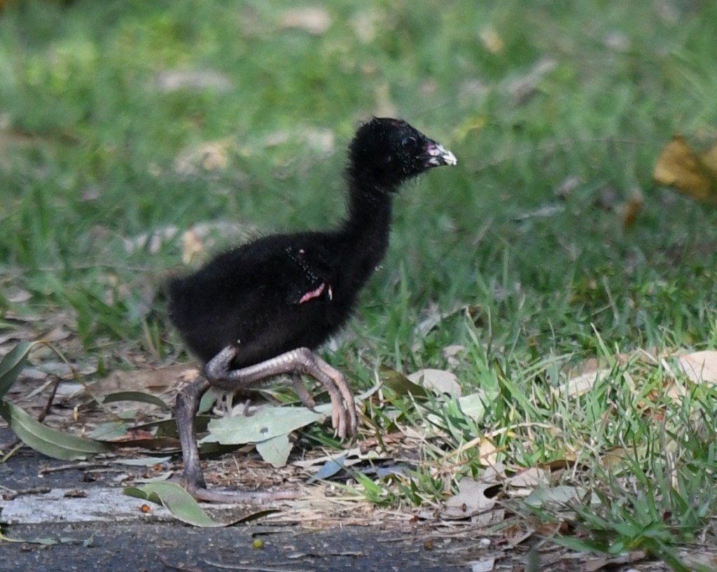 The cutest sighting of the day was first up: a baby Swamphen and its parent walking across the path. Swamphens are generally one of those obliging photographic subjects: they don’t fly off straight away when you get too close, and they’re rather photogenic and visually interesting. (Other birds in this category that come straight to mind are Magpies, Kookaburras, Dollarbirds, and – to some extent – Eastern Yellow Robins).