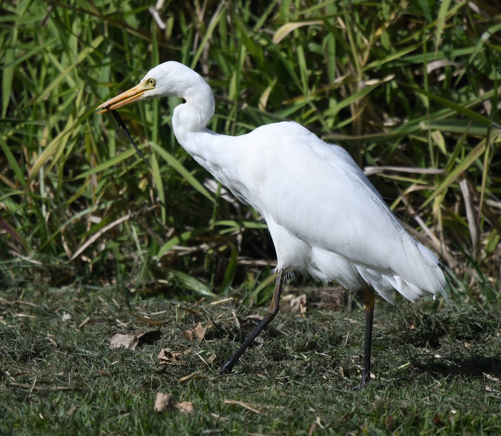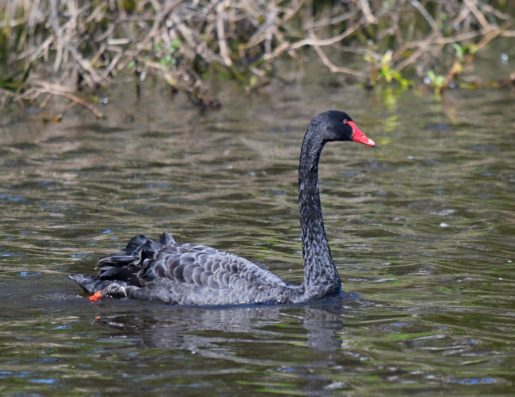 Onto the lake area. There is a boardwalk-style viewing area which is excellent for resting one’s camera on as one attempts to take the world’s best Black Swan photo. Seemed like a few varieties of water birds here – domestic ducks (cute-looking, but supposedly feral), Hardheads, Wood Ducks, Wandering Whistling Ducks, Pacific Black Ducks, various Cormorants and – sitting on the “island” in the middle, a large Great Cormorant (a lifer!). An Intermediate Egret also lurked along the edge of the lake, snapping up a lizard from the reeds.