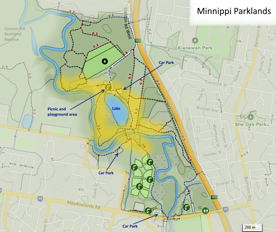 There are a couple of ways to access Minnippi Parklands, both of which offer excellent car parking: from the north, along Stanton Rd West, or from the south, in the Preston Road Park area off Meadowlands Road or the Skate-Track Carpark off Kate St. The former is probably best and gets you straight onto the lake area, if that’s what you’re after.