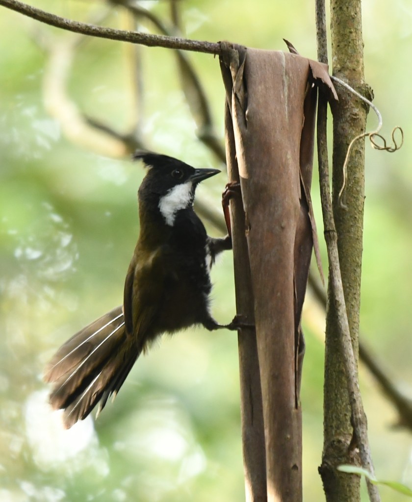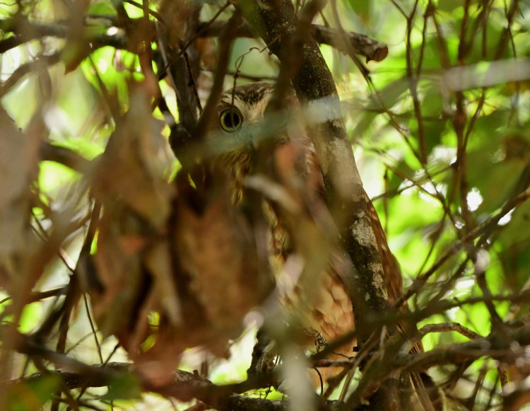 Soon after we heard and felt small bits of fruit dropping down from the upper canopy, and sure enough there were some Topknot Pigeons up there causing havoc. Too far up and obscured so all but impossible to get a photo.