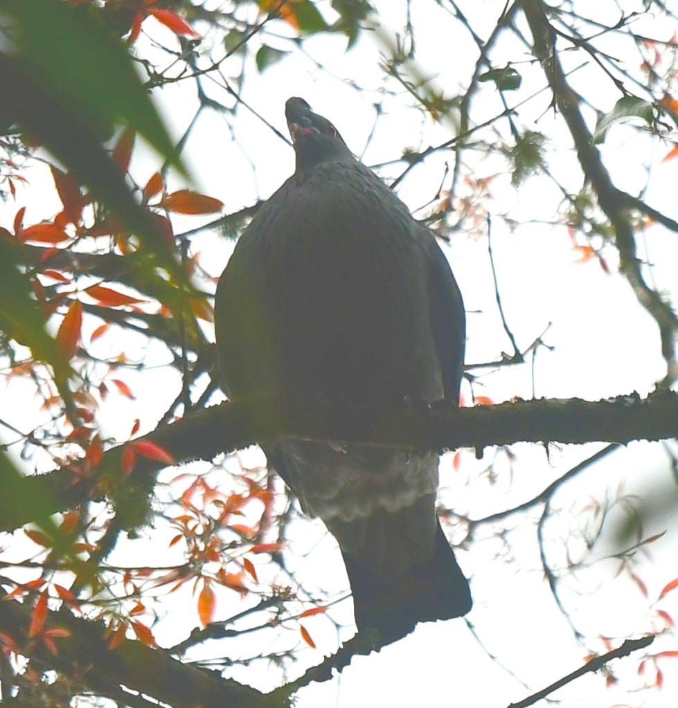 As it was a Sunday and time was marching on (despite arriving quite early, we had really taken our time so far), more walkers including larger groups were on the tracks. People come for the forest, not just the birds, which is fair enough! On the way out we encountered another few pigeons way up high. I only managed one subpar shot. Check the photo – maybe it’s just the angle, but this one looks fat!