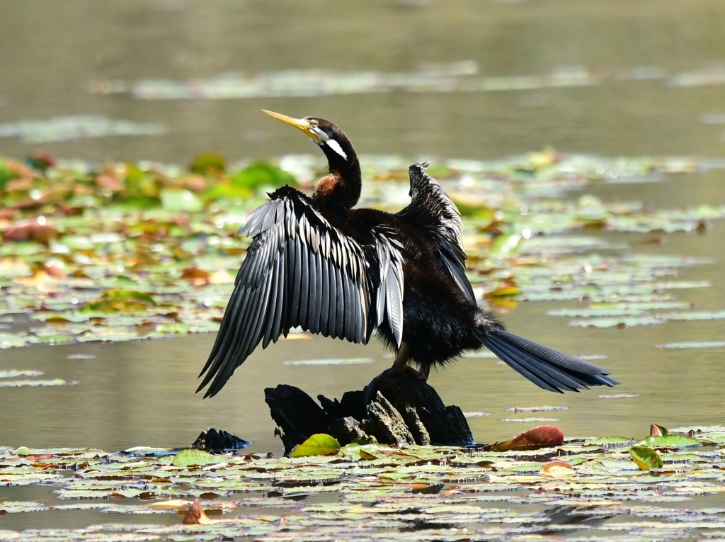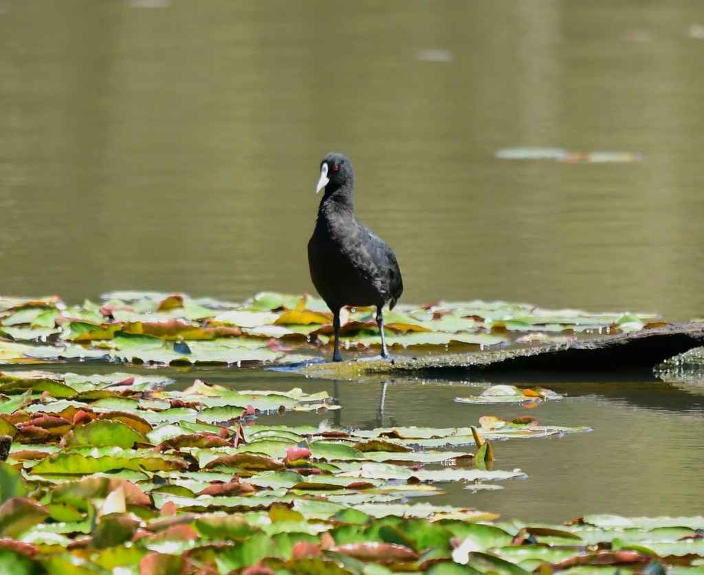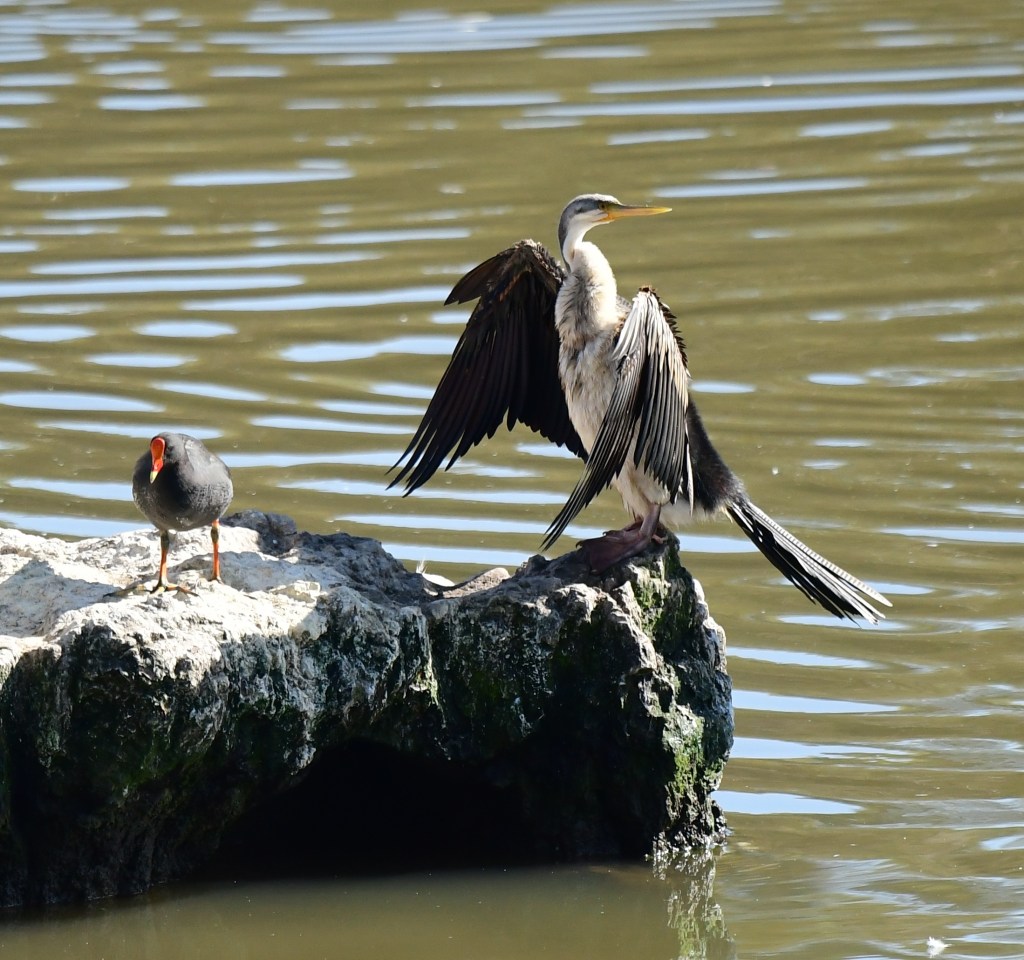 Coming right around the northern end of the lake I got a little closer to the Whistling Kite, but it wasn’t until I reached the the eastern side that I started to see interesting birds again. Here there is a bikeway bridge which is quite high and well-constructed. Just south there are a few spots (including a little bird hide) you can see the lake from – where I nabbed good photos of another Magpie Goose, a Eurasian Coot, and a Darter drying itself off on a small rock.
