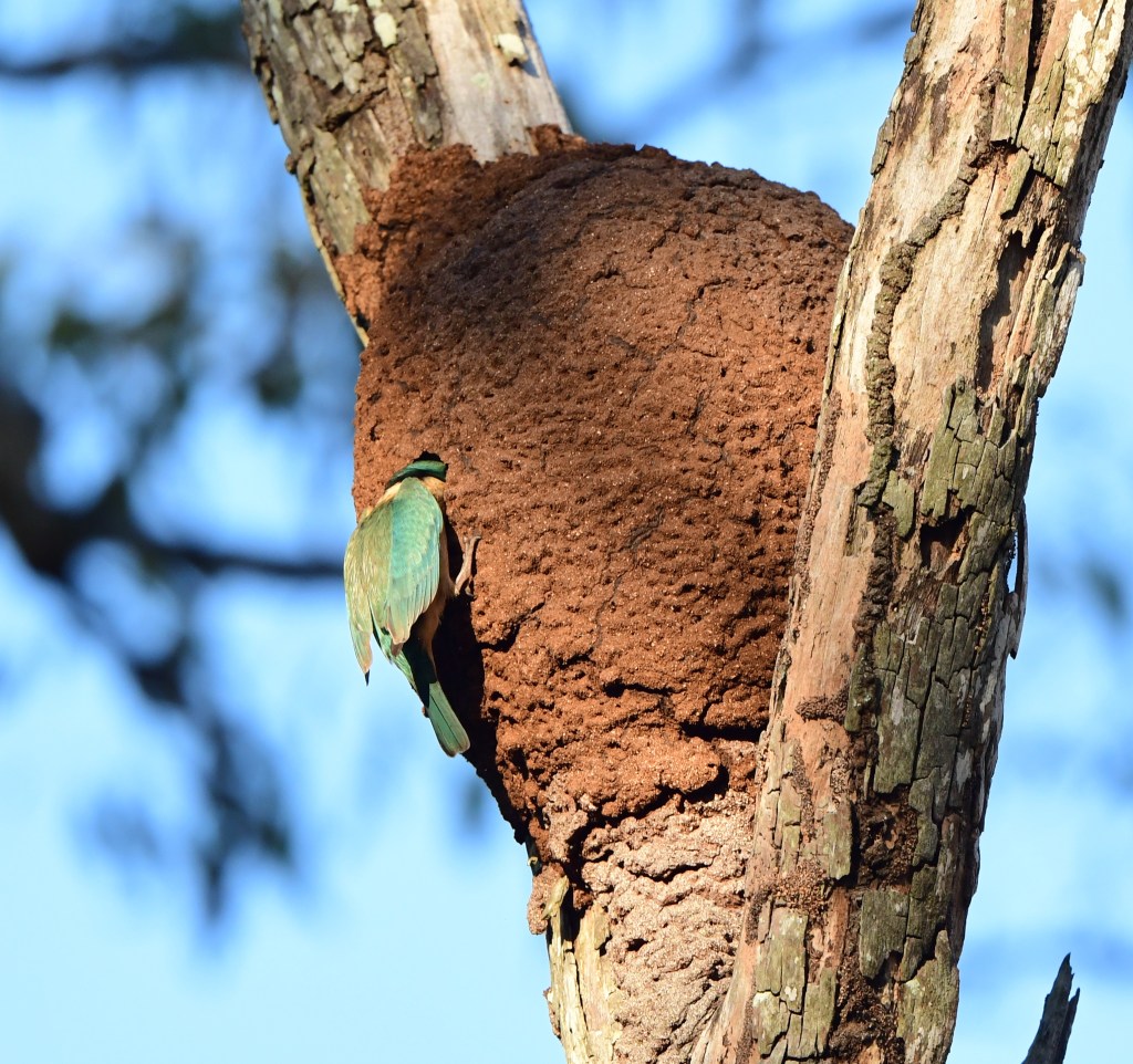 I readied my camera, cycling slowly with it swinging awkwardly around my neck. I didn’t see any birds of note until well over a kilometre into the bike path, by which time I had realised that stopping and taking photos was rather cumbersome, and I always had to be on the lookout for fitness-based cyclists rushing past. The birding started to get more rewarding when entering the casuarina-dense areas as the path neared the highway, and I was able to spot a Sacred Kingfisher including seeing it returning into its nest in a termite mound up a tree. Soon after, two Mangrove Honeyeaters appeared. Otherwise it was fairly quiet… except for the constant nearby highway noise.