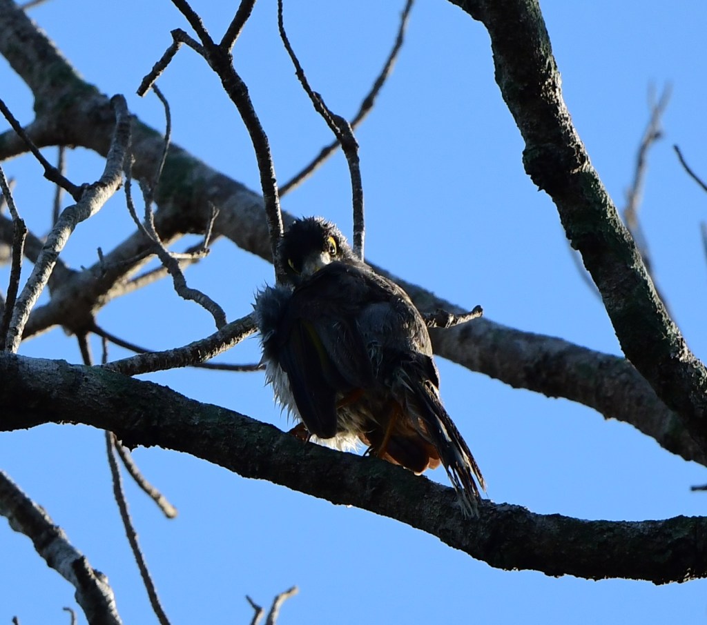 Continuing the circuit found Brown Honeyeaters and a few Mangrove Gerygones, then the bird action amped up considerably, with good encounters with a Rufous Whistler pair and a superb photo opp with another Sacred Kingfisher. More Mangrove Gerygones hopped around and then a White-Bellied Sea-Eagle circled close by, and I hastily grabbed some photos of it through an overhead gap in the brush. This section felt alive with birds, the brush was fairly dense with vine covering but that didn’t stop me also seeing a Forest Kingfisher and a cute Grey Shrikethrush.