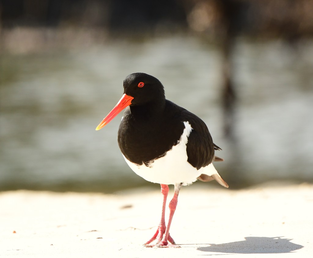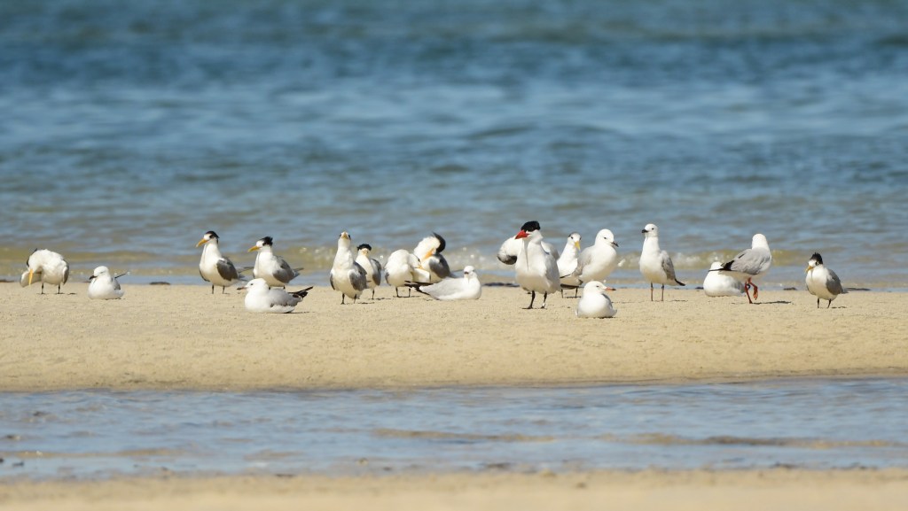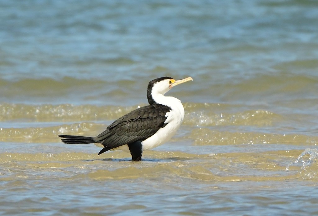 Here there was a mixture of Silver Gulls with Crested and Caspian Terns on the water’s edge, as well as a Pied Cormorant standing knee-dep in the surf. (I could tell it was a Pied Cormorant and not a Little Pied by the more ivory-coloured bill, and the “black trousers”). Further round was a decidedly not-shy Pied Oystercatcher, its vivid colours making what was surely Photo of the Day.