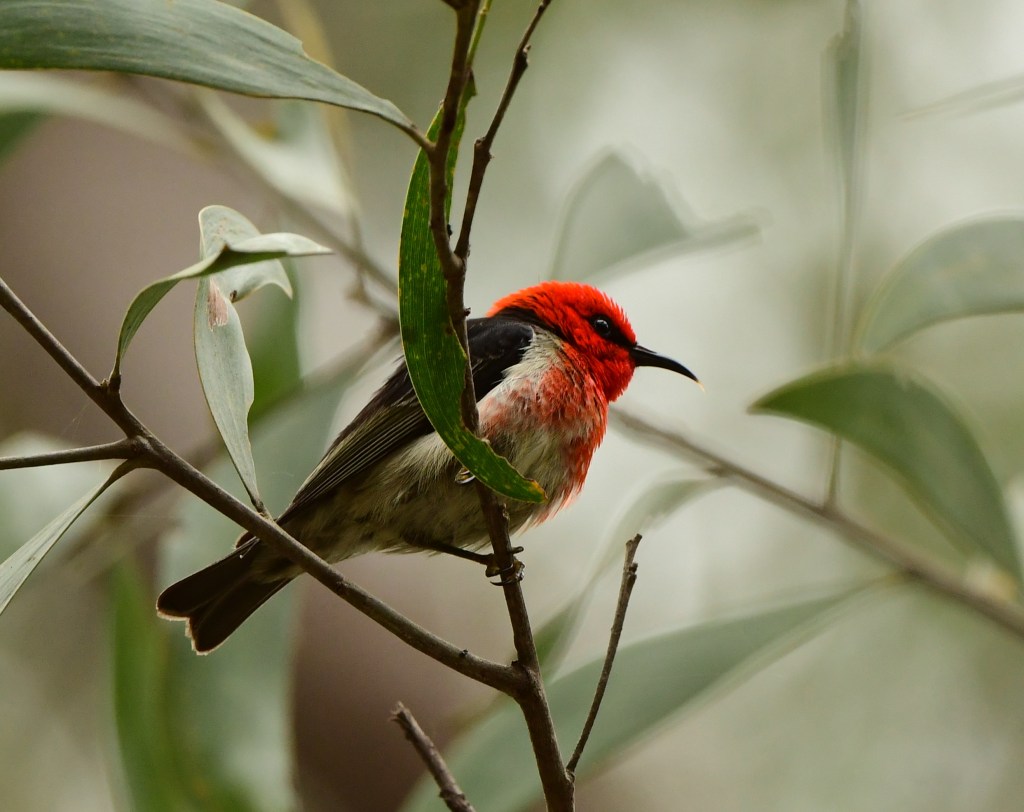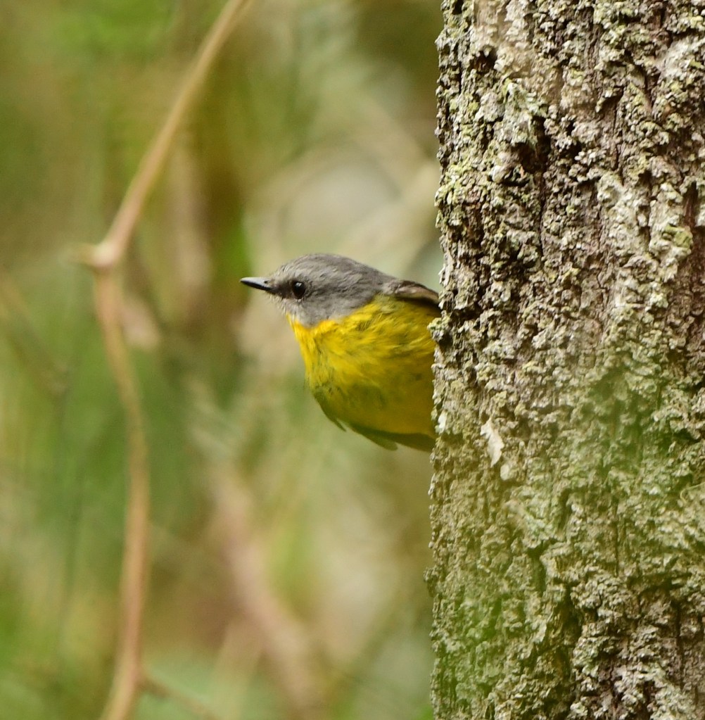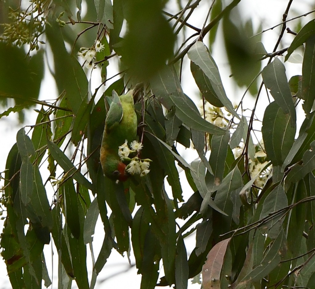 However, things really picked up then. I saw an Eastern Yellow Robin collecting material for its nest, and even saw it nesting right on the side of the path, then continuing north (back on the Grey Gum loop now) I saw a Scarlet Honeyeater male and then – quite high up – my first ever sighting of a Little Lorikeet. Actually there were a few, but they were quite far away, so I had to settle for mediocre photos, but at least I had seen something new.