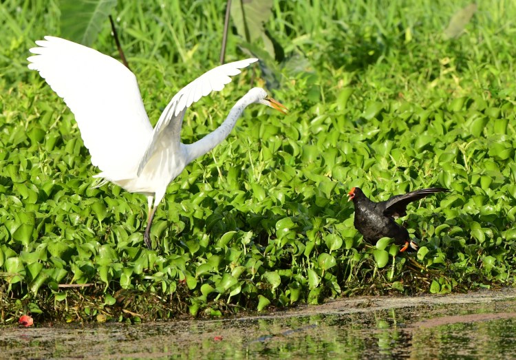Great Egret and Dusky Moorhen