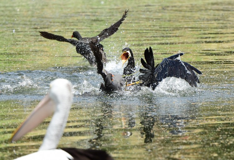 On the first visit I was lucky (!) enough to witness a couple of Dusky Moorhens getting into a fight with an Australasian Darter. I wasn’t sure what prompted it. A Pelican watched on as it got increasingly heated, but all the birds seemed to paddle away without any real injury.