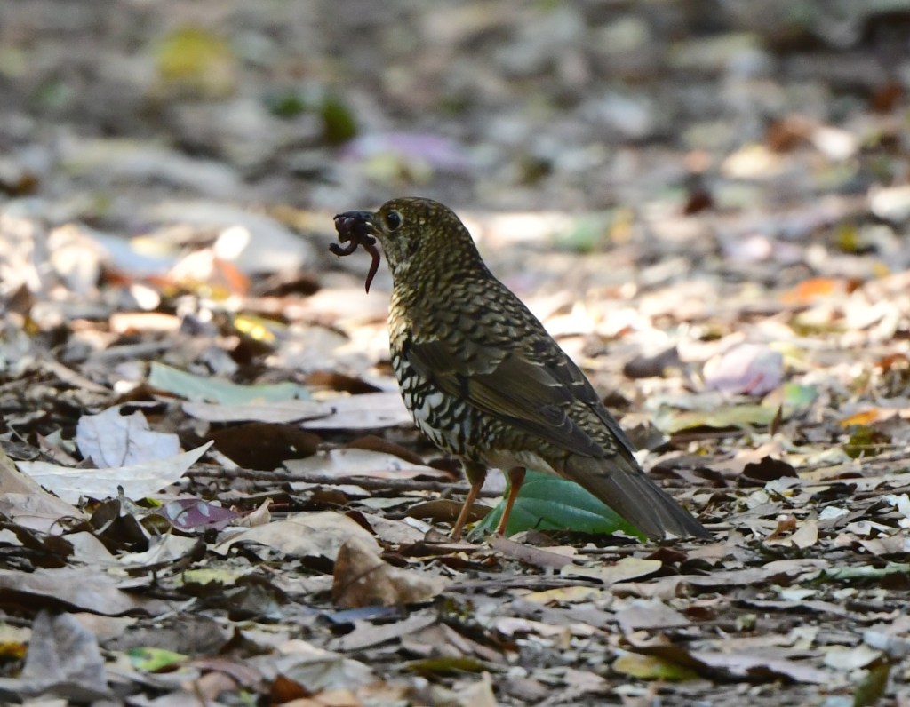 A female Satin Bowerbird was next up, then we spotted some Bell Miners drinking at the creek – we lingered here for quite a while, also seeing a Yellow-Faced Honeyeater and a Brown Gerygone. Then on the path was a Thrush finding worms in the leaf litter (either Bassian or Russet-Tailed, this is an overlap area for these species so it’s hard to know).