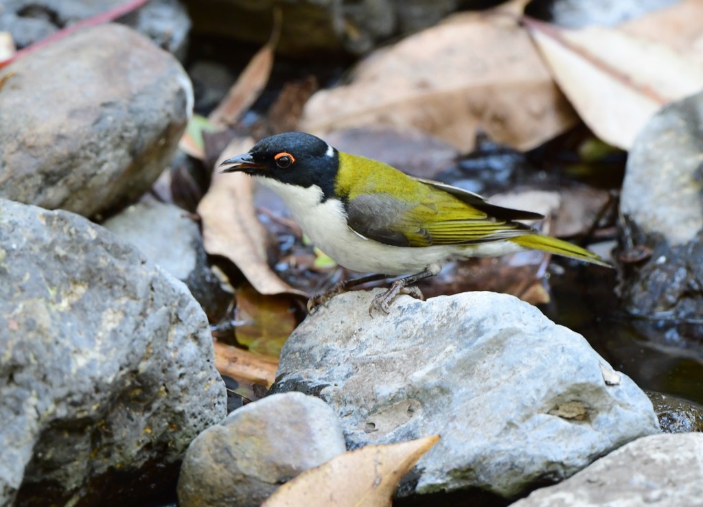 We had to pick up our cameras now and again in the midst of eating for a photo-opp with a busy White-Throated Treecreeper (is there any other kind?), and then some White-Browed Scrubwrens and a White-Naped Honeyeater on the rocks by the water – angling for a drink, it looked like.