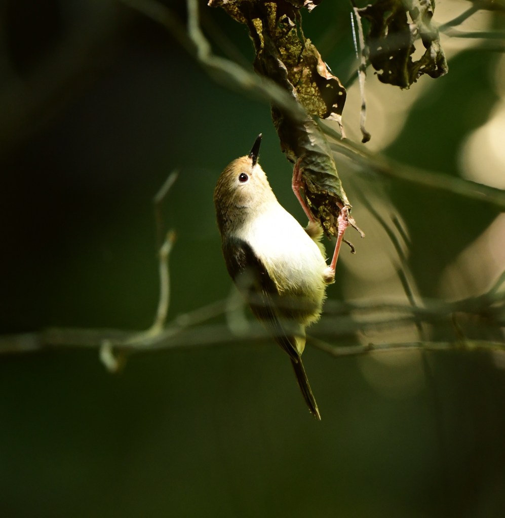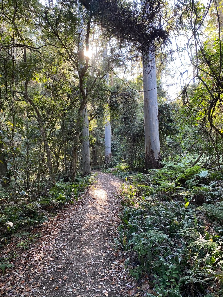 After the lovely “hillside” section, the track starts to follow the creek more closely, with birds glimpsed flitting up from the steep embankments. There was one long stretch where the bird of the day flew (briefly) in: a Rose Robin! Soon after we saw a Crested Shriketit, which became confusing because soon very after that we saw a couple of male Golden Whistlers, one of which we watched for quite a while as we quietly ate some lunch by the side of the creek. The presence of the very similar-looking Golden Whistlers made me doubt I had actually seen a Crested Shriketit at all, but checking the camera photos proved it was indeed there.