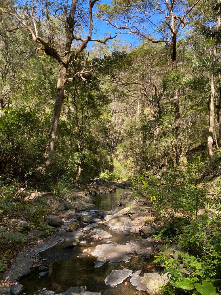 The track crossed the creek several times and once or twice we wondered if we were still going the right way; the only sign we saw was a Scenic Rim Trail marker. The situation wasn’t helped by a huge tangle of tree across the track which had to be awkwardly clambered over. After that the going became steep and upwards, and there was a waterfall and a few more water crossings. This was at the extreme south-eastern edge of the circuit.