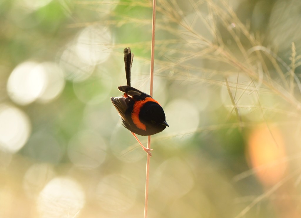 I proceeded down the path (the “main long path” in photos above) towards the Bunya Crossing Reserve, but was soon enticed by some overgrown side-trails leading down to the creek. It was here that I encountered some Red-Backed Fairywrens and Red-Browed Finches playing around in the tall grass; the morning sunlight streaming in made for some good photography potential. Tramping back to the main path also picked up a female Leaden Flycatcher, which was a welcome sight too.