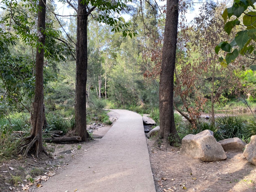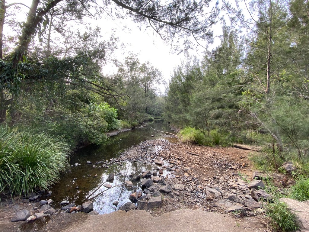 The “track” down from the oval towards the creek is more of a dirt road – and bizarrely, I saw a police vehicle traversing it when I was there. Eventually the dirt road narrowed into a walking path and wound around towards the little concrete bridge that crosses the river (which is, at this point, more of a narrow creek).