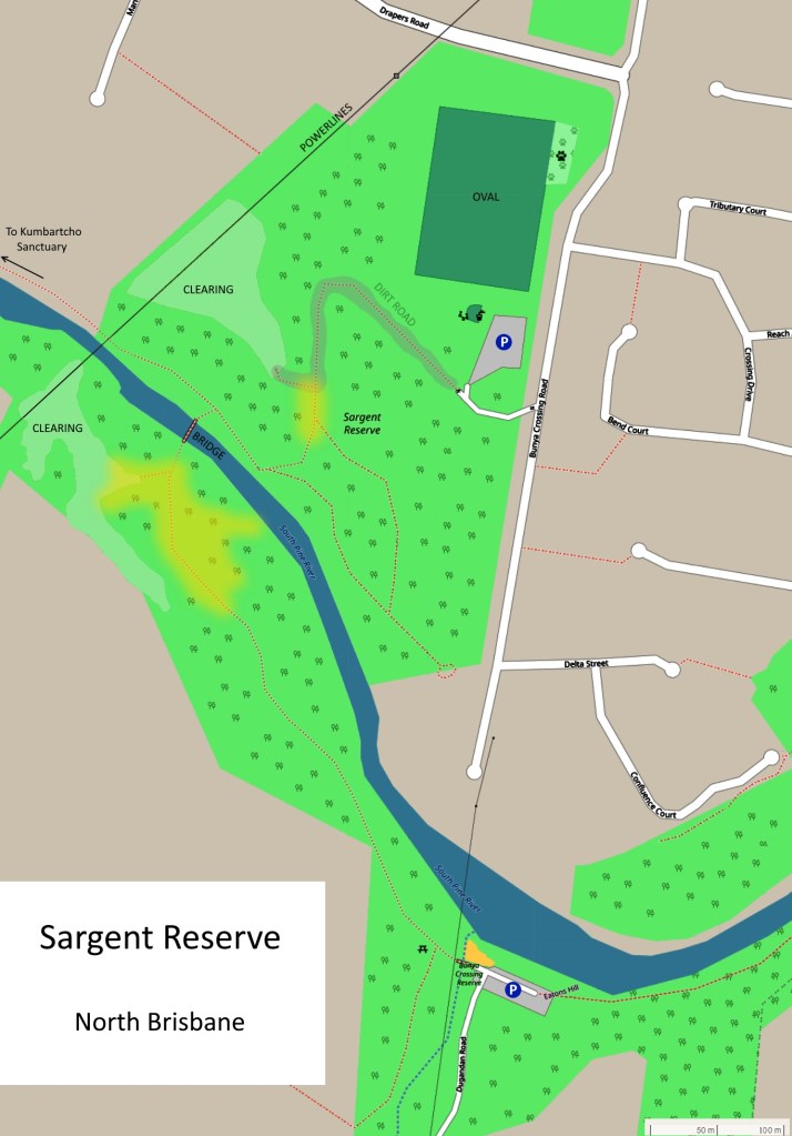 Sargent Reserve is a rough patch of bush that straddles the South Pine River. A sports oval sits in the north of the reserve and at the very south where the river bends sharply is Bunya Crossing, which is popular for swimming and fishing.