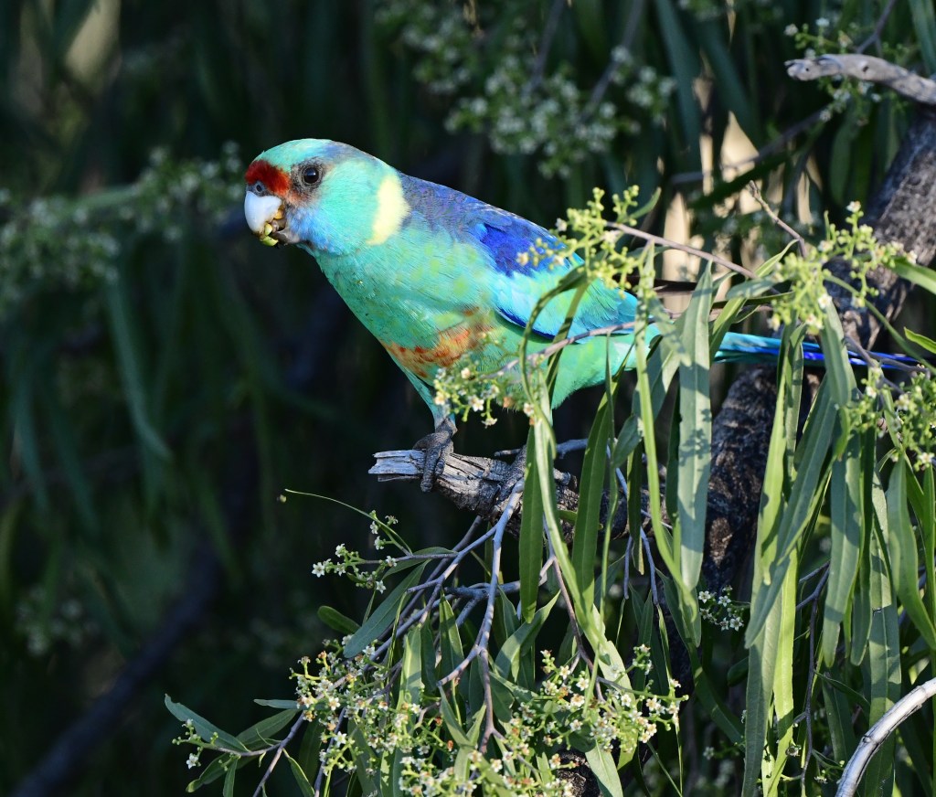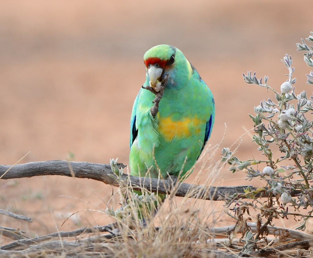 A few hundred metres further the road ends in a little loop and a small sign announces the start of the “Mulga Walk”. At this turnaround point, however, despite the few trees and quite dry conditions, we found a few birds: a Red-Capped Robin female, which was soon joined by a male, and a couple of Bourke’s Parrots showed up too – a complete first for us. We had to be quite patient with the Bourke’s Parrots as they seemed quite skittish, and their subtle pastel colours were difficult to capture in the slanting winter morning light. In the end we got probably the best pictures we could hope for.