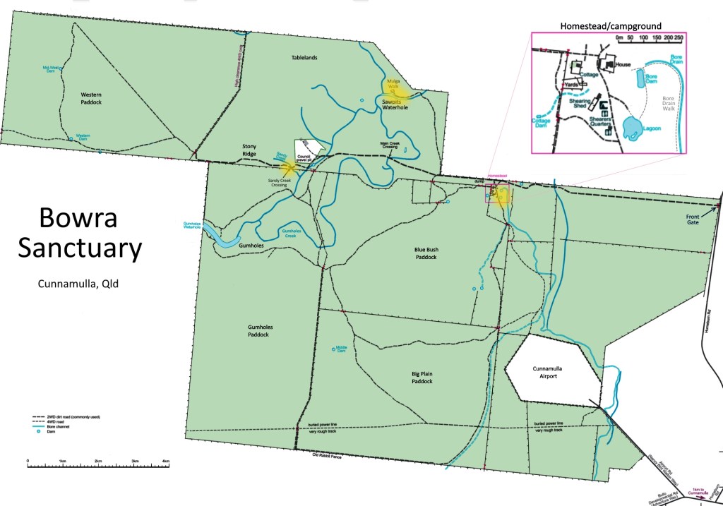 There are many eBird hotspots picking out different sites within Bowra Sanctuary. Below are just the main ones.