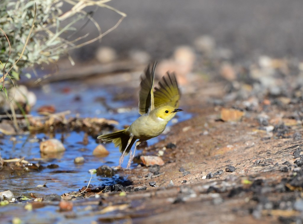 I’m not sure if it’s supposed to, but the white water tank leaks water, and the birds love it. The water runs down the side of the road and we saw plenty of birds coming down to drink from that rivulet too. A Spotted Bowerbird was easily photographed on the fence, and further along a Brown Honeyeater decided to hop along the ground for a while.