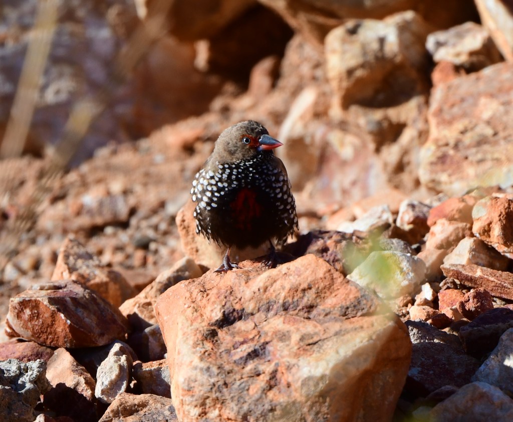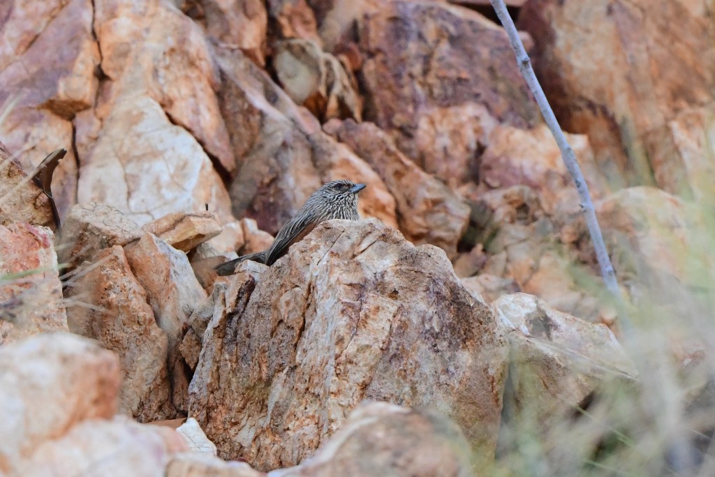 …and then we heard the unmistakeable super-high pitched peep of a Kalkadoon. Getting a visual on it was the next challenge – but we spied it half way up the hillside, and slowly approached, thinking there was actually more than one. We ended up giving a merry chase (sorry, birds!) and gained a better shot on the rocks near the top, but apart from a heart-stopping what-could-have-been moment where one was atop a high rock in perfect sun (for a microsecond), that was that. They then disappeared as mysteriously as they had arisen. Success, though!