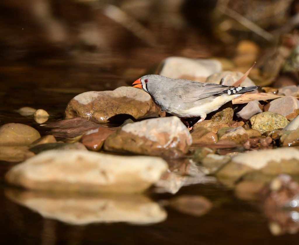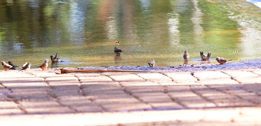 Incredible stuff, and plonking down by the water on the far side of the concrete causeway (which was easy to cross as it had only an inch or two of water flowing across), we were privileged to see a Painted Finch come down. Then, it was all go, with Budgies, Long-Tailed, Zebra and Double-Barred Finches, Brown Honeyeaters, and a ton of Yellow-Tinted Honeyeaters all coming down to drink.