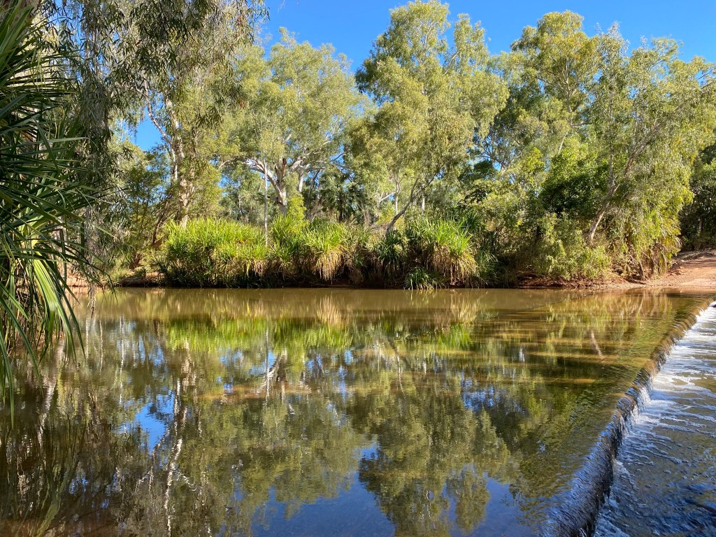 We stopped immediately as we approached O’Shannassy River (coming from the east), not because we knew anything about it, but because we saw finches in the long grass on both sides of the road. They were predominantly Crimson Finch, but we then spotted both Double-Barred and Long-Tailed Finches too – especially obvious when they decided to play in the water where the river flows across the road.