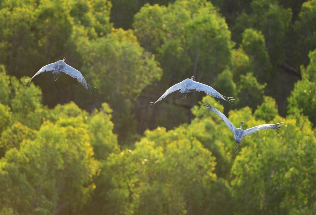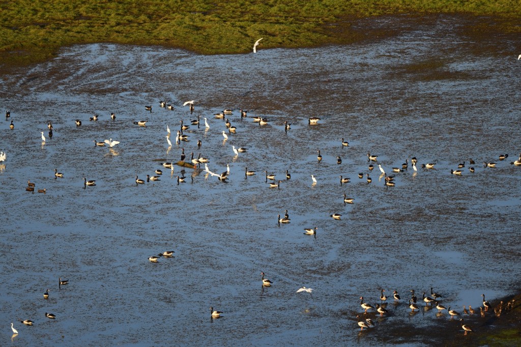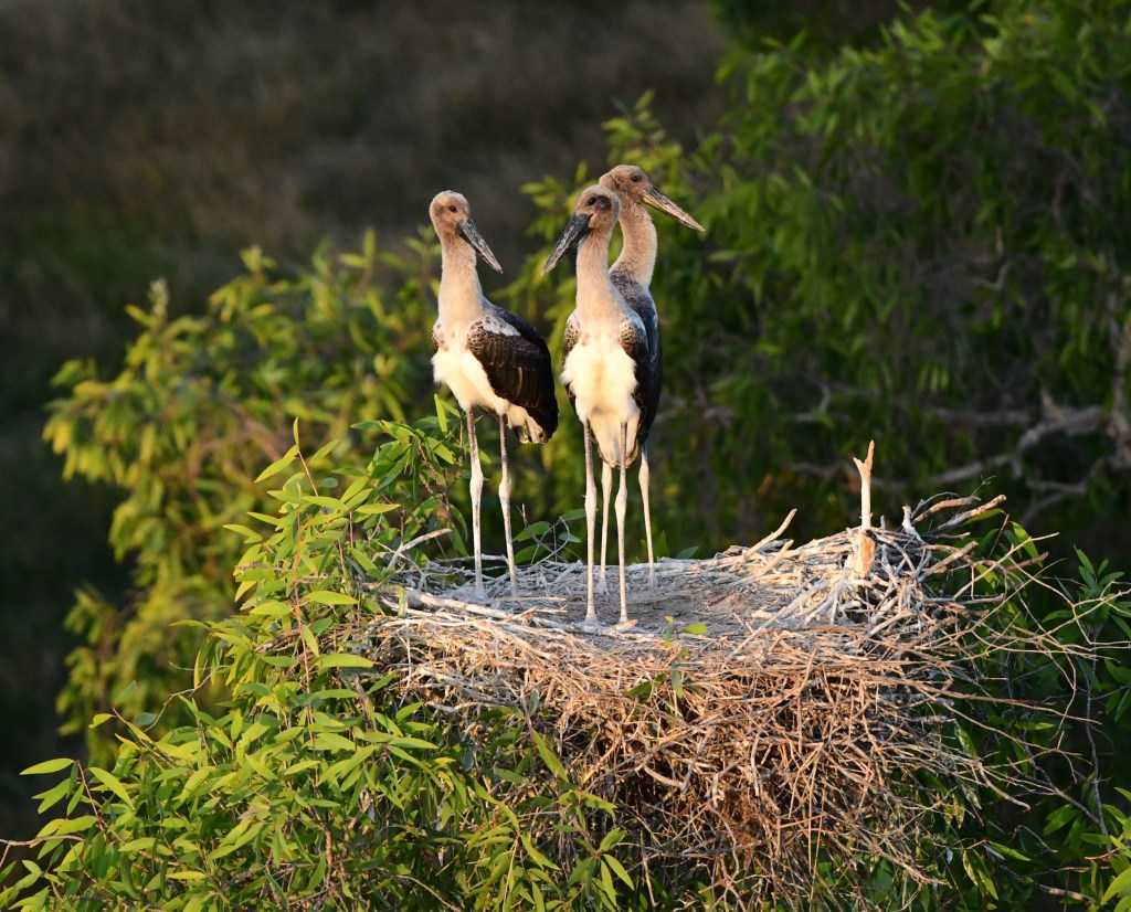 Water birds from the airThis place is called “Dinosaur Valley”, presumably because it’s really old. Incredible landscape.From the air you can see how much of Kakadu is floodplain, holding life-giving waters even well into the dry seasonBrolgas flying away from the big annoying buzzy thingOur chopper pilot kept the best to last, giving us a fly-by of this Black-Necked Stork nest with a couple of storky youngsters hanging out in it.