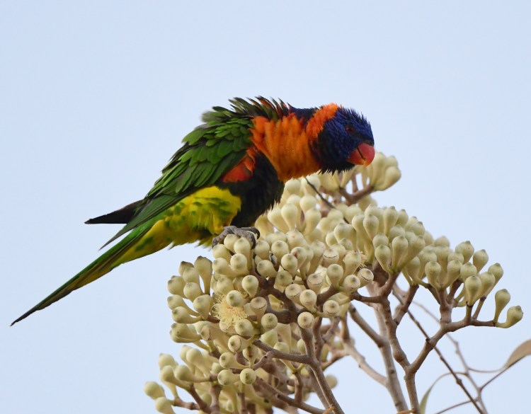 The first bird we came across after arriving and wandering down to the water was a Buff-Sided Robin, and boy were they friendly, at least in the areas near the campground (they seemed to mainly hang out near the water). In the campground itself, which holds only a couple dozen sites and is often booked out well in advance, there are also a few birds around – we had Red-Collared Lorikeets on our first morning, according to the Ranger a little unusual for the time of year and the product of some rain the previous month bringing a few trees to flower. White-Gaped Honeyeaters flitted in and about the bushes around the place, sometimes coming quite close to our camp site. Like a fast-moving Lewin’s Honeyeater, though, it was tough to get them to sit still long enough for a photo!