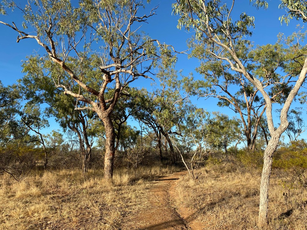When the trail – which at this point is pretty vague, just one small sign easily overlooked – veered away from the creek into dry and sparser grassland, more and more Crimson Finches popped in, and we ended up counting at least a hundred in total. This was made easier when they periodically flocked onto the branches of dead trees rather than disappearing into the grass. You can never have too many finches, they are just so cute.