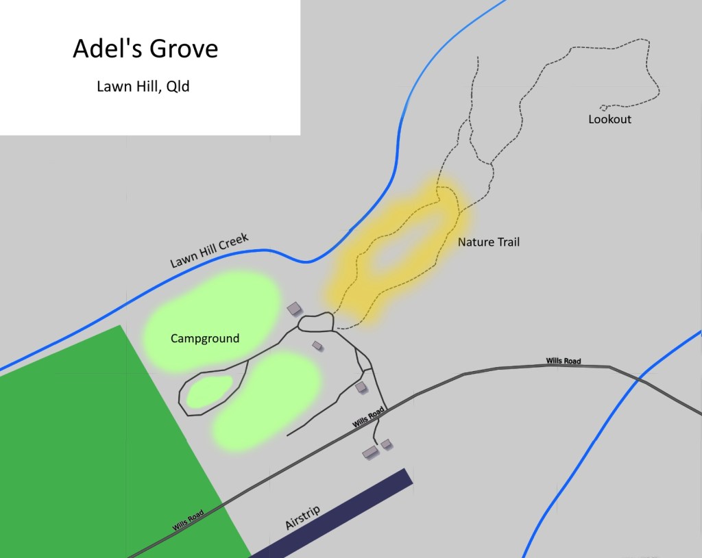 While there were a decent number of birds flitting around the campsite area – a Grey Shrikethrush close encounter comes to mind – the main interest here (apart from popping over to Lawn Hill National Park, if you haven’t already) is the Adel’s Grove Nature Trail. It begins on the north-east edge of the camp area and has a modest (read: tiny) sign which you might easily overlook. It is also known as the Lookout Trail as it ends at a hill-top viewpoint.