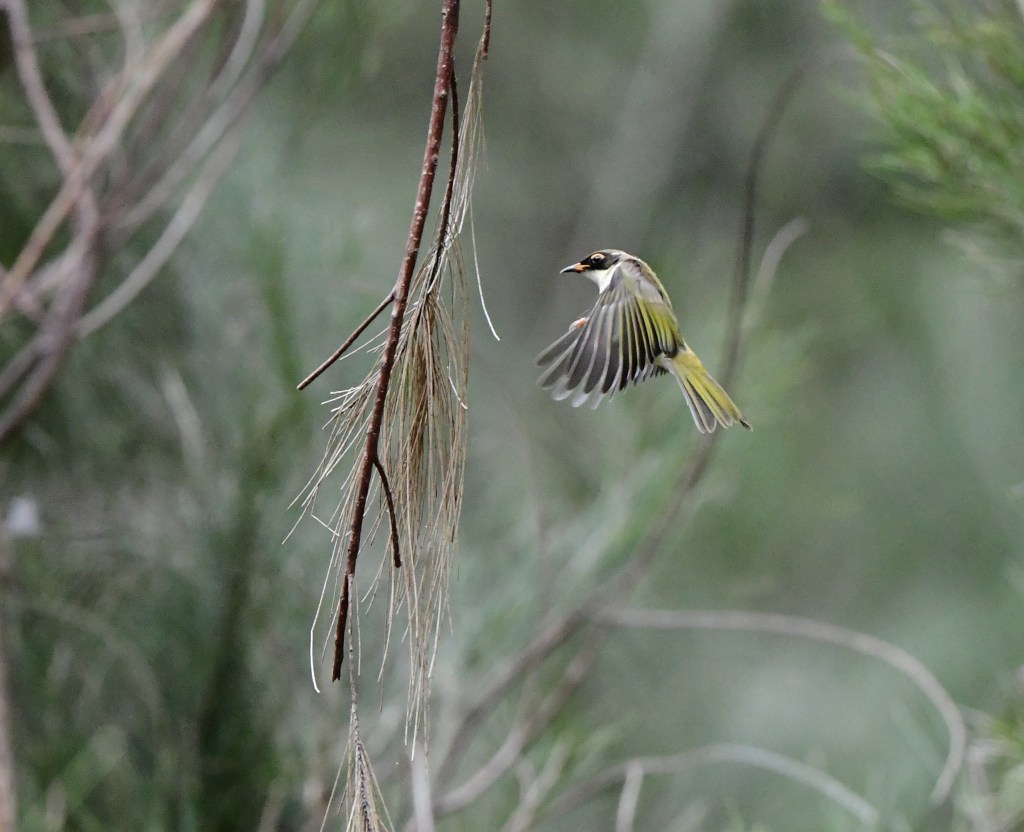 Then further along there were a lot of she-oak trees bent right over, presumably by wind or weather of some kind. Here we found Red-Browed Finch and more White-Naped Honeyeaters plus a host of other birds (Spotted Pardalote, White-Browed Scrubwren, White-Eared Honeyeater) using the nearly horizontal trees to get to the water, or just doing their thing in the area. It was one of those lovely moments when there’s just a bunch of nice birds around and you don’t quite know where to point your camera.