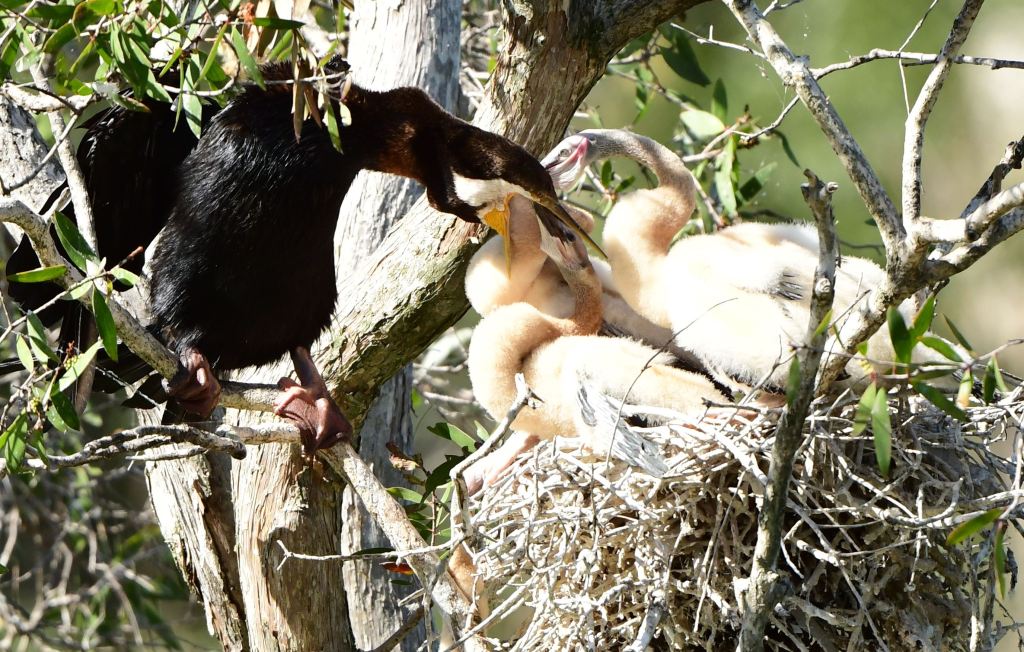 There is a path all the way around Messy Lagoon, but it can get very boggy – even impassable – depending on the season and recent rain. That makes the moniker “Messy” appropriate, though to my mind the lagoon water itself is pretty messy too, with lots of brackish areas, tangles of melaleuca (stringy barks) in the water and on the water’s edge. This lagoon is also known as Bittern Pond due to sightings of bitterns within it. My most memorable circumnavigation of this area was on my March 5 visit, where I saw a Darter parent feeding four hungry Darter youngsters still on the nest. The little ones were getting their heads right down the parent’s throat… and one was struggling to stay in the nest at all.