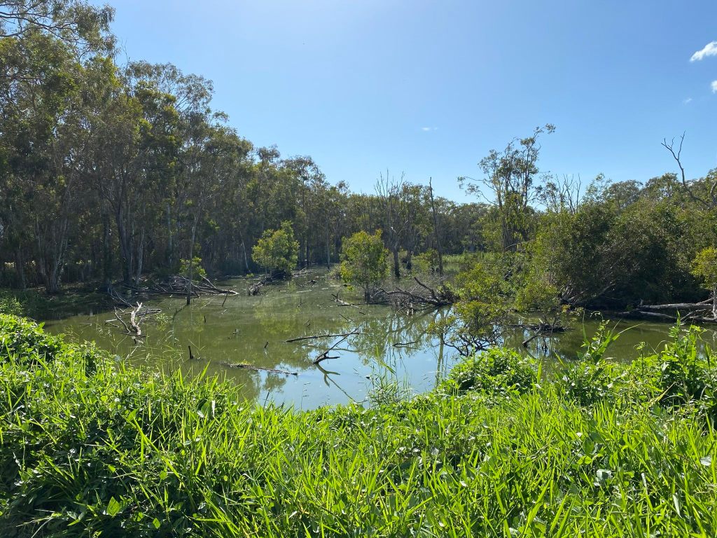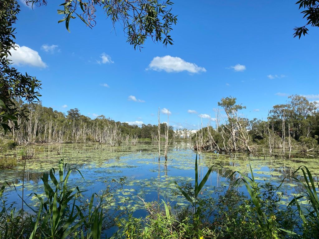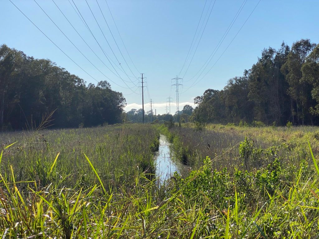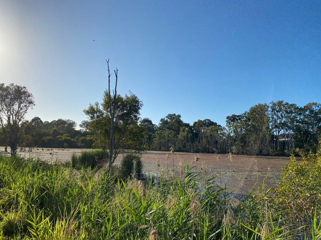 At the west of the wetlands the powerlines curve away to the south. There are still good birds in this area, and one of the trails crosses a wooden bridge and continues west all the way until it hits the nearby Port of Brisbane Motorway, if you’re inclined to go that far.
