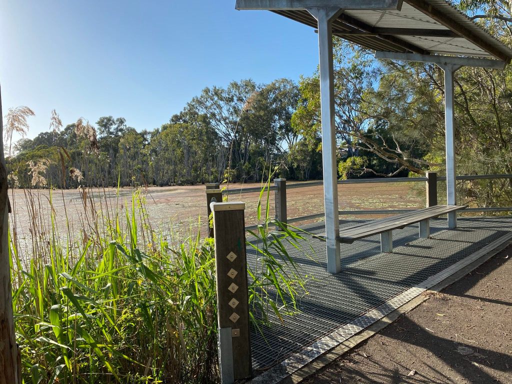 Just beyond Lily Pad Lagoon, there is a four-way intersection. Turning left leads to a viewing platform with seating, though it’s oriented completely the wrong way for the early morning sun – ie., pointing straight into it. (There are a couple of other bench seats to plonk down on too, which are handy as you may be inclined to spend quite a bit of time at these wetlands.)