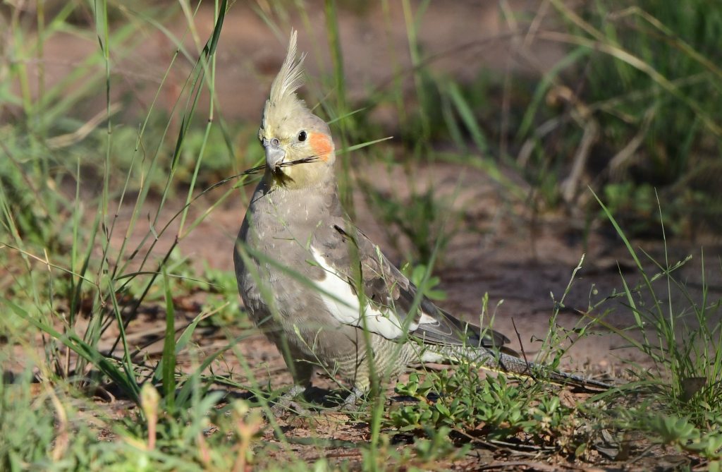 On Jan 10 I returned again, and this time there were Cockatiels foraging on the ground near the corner of Mosquito Creek Road and the highway, both males and females (the males have a much more distinct yellow around their red cheek patch). I counted 10 in total, all very charming birds.