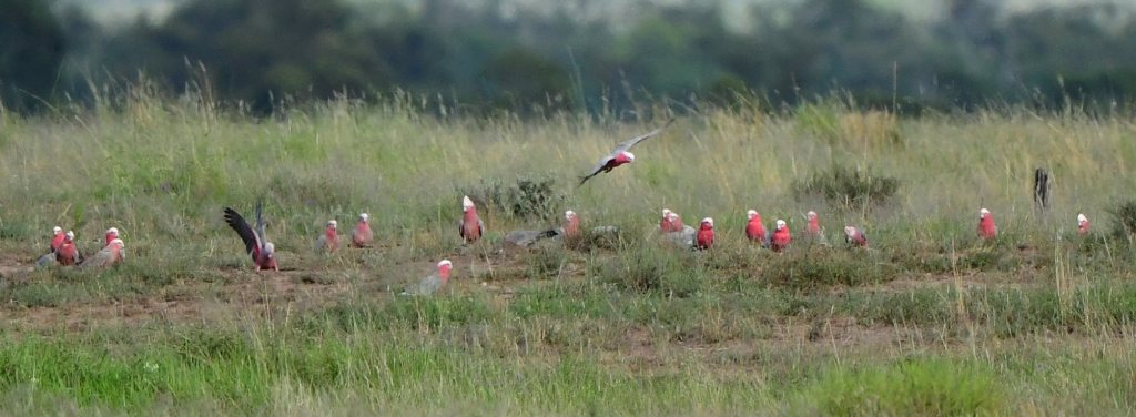 There were more Galahs here than yesterday, their blush pink standing out against the dry green fields.