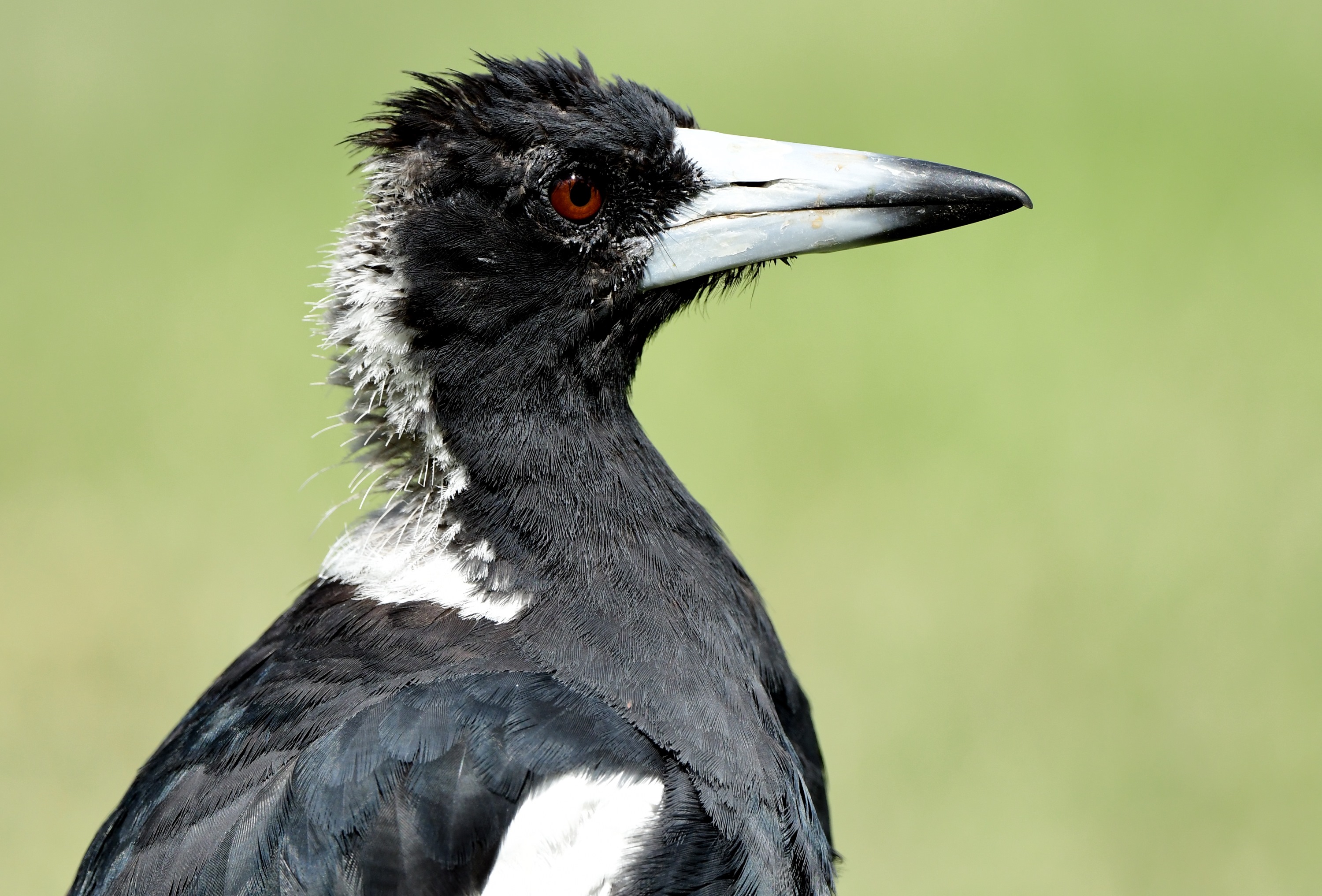 While exploring the (largely devoid of people) nooks and crannies of Albert Bishop Park (which has a small cemetery), I found a Sacred Kingfisher, and more magpies. I took a portrait shot of one of the maggies, which has subsequently become my favourite magpie photo, due to showing a little feather sheen on the back, an almost “painted on” look behind the head, and of course showcasing that hefty beak.