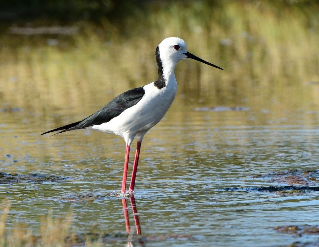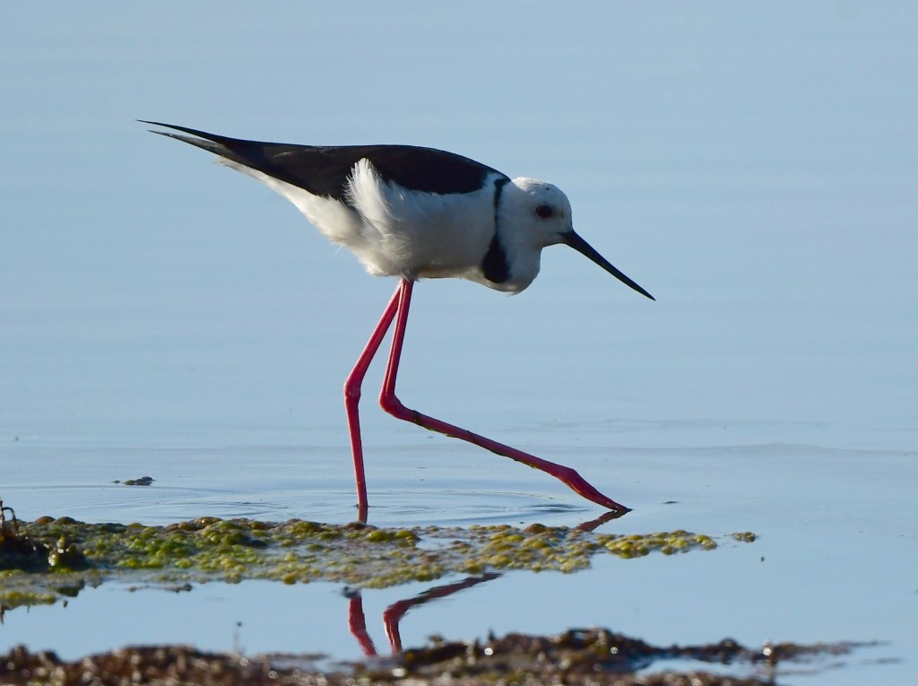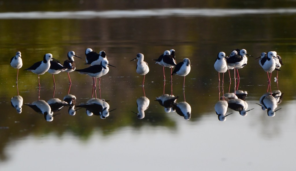 At this time of year – at the end of the dry winter months – the main lagoon had shrunk quite a lot so I fancied my chances of getting some close-up shots of Pied Stilts and the half dozen or so Red-Capped Plovers I could see in the distance. After traversing one of the “mown strips” towards the main lagoon, the ground underfoot became dry mud, but before I could get too close to the Plovers the mud became sticky and wet, so I aborted. I did however gain a wide mirror shot of the Pied Stilts which I was happy with.