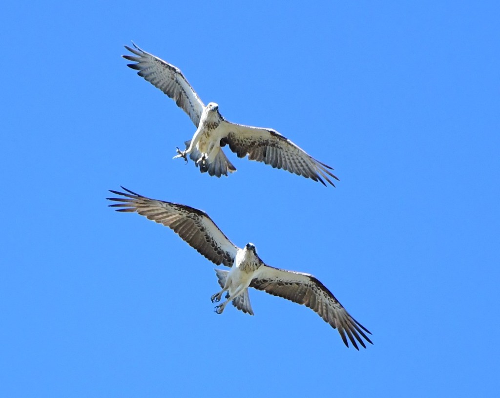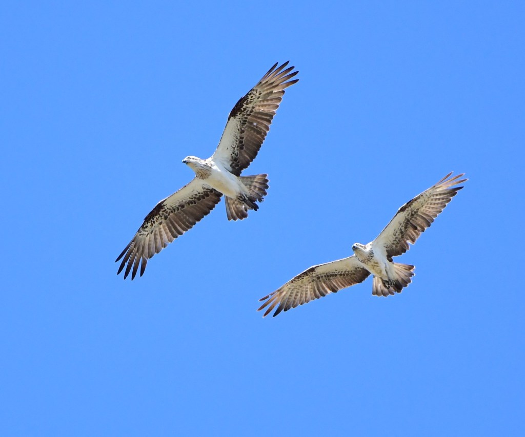 I am not sure what attracts raptors to this area, especially Ospreys (perhaps the wide nearby brook rather than the half-dry lagoon), but there were two majestically flying in tandem.