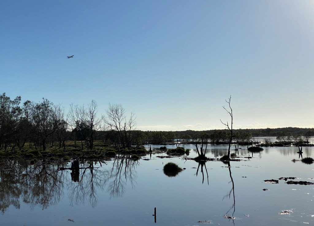 Here was a good chance to see Pied Stilts a bit nearer, with Pelicans, Pacific Black Ducks and other water birds in small numbers too. Sandpipers, Grey Teal and Black Swan are also commonly reported on eBird. Aircraft from nearby Brisbane Airport can be seen taking off or landing across the water.