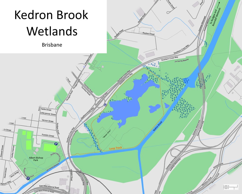 The highways mean parking and access is something of an issue. One spot that is sometimes used is off the edge of the roundabout at the end of Toombul Road, where there is a grassy verge that can fit a couple of vehicles. It’s very unofficial, and I have avoided it. If you do use it, don’t block the gate that leads down to the wetlands.