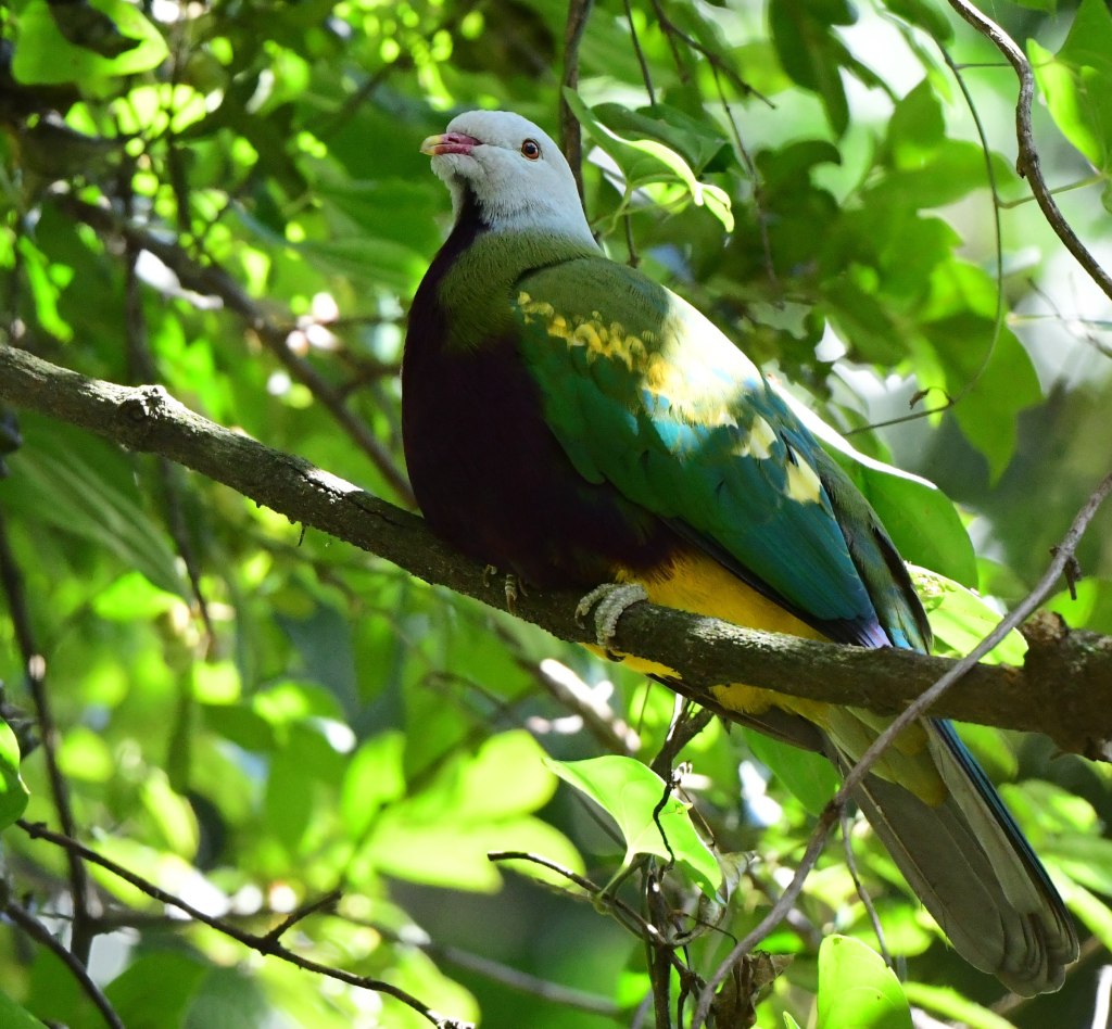 A dozen Topknot Pigeons alighted in one of the higher mossy trees soon after; whenever I see these birds I am reminded that they apparently once roamed in enormous flocks. Sadly, due to deforestation and shooting (!), this isn’t the case any more.