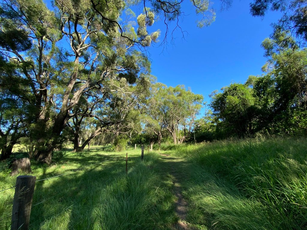 There is a 2km flat grass/dirt walking circuit containing remnant bushland (well cared for by a local bushcare group) which is best accessed from the end of Cliveden Ave (off the main north-south drag of Oxley Rd). There isn’t much at the start of the walking trail, just a sign and a little gazebo – in fact it can be hard to spot where the circuit actually begins. Once found, though, the vibe is basically fenceline on one side and bush (and nearby creek) on the other. I set off at 6:20am.
