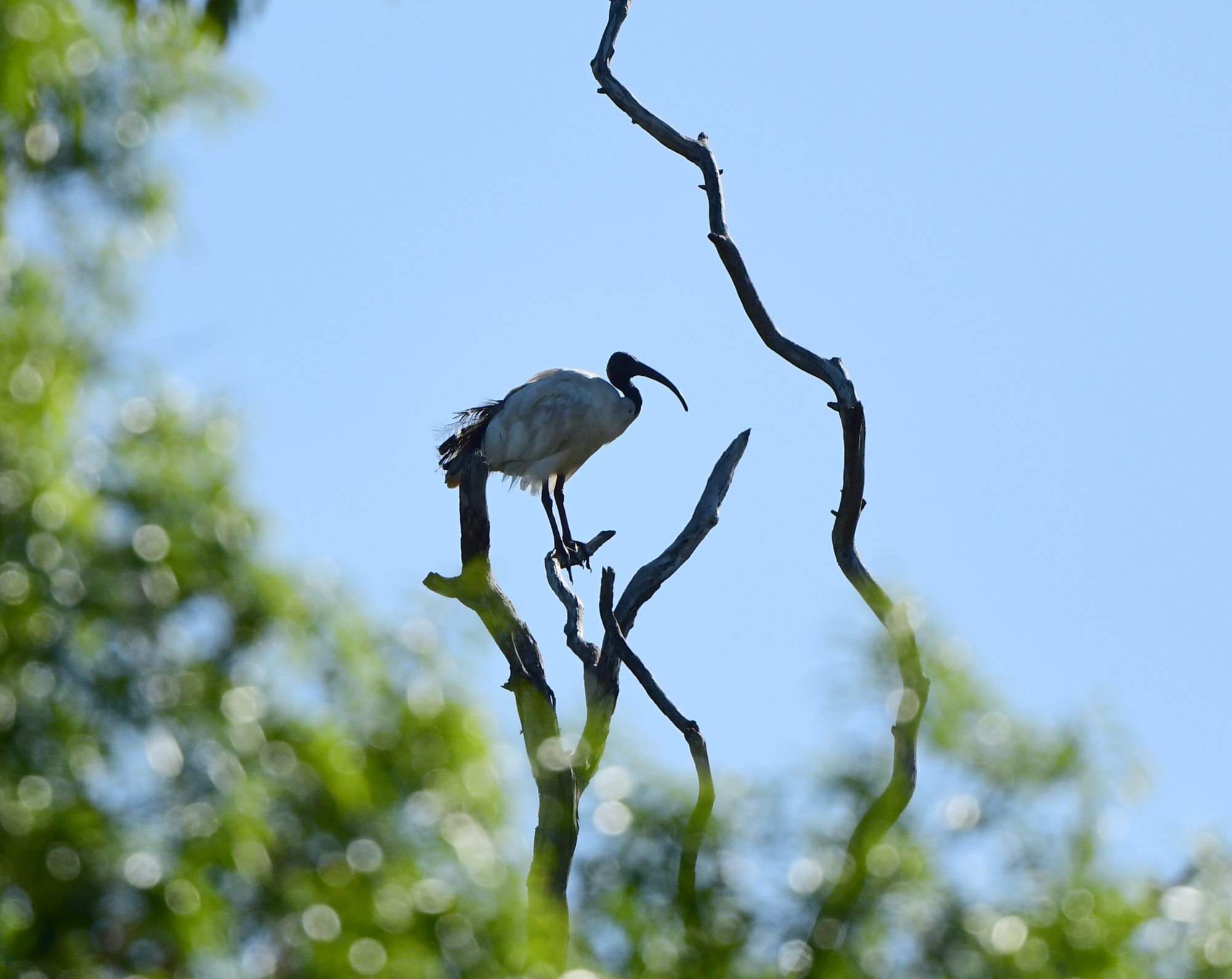 A female Figbird and a White Ibis chilling out on a bare branch were next.