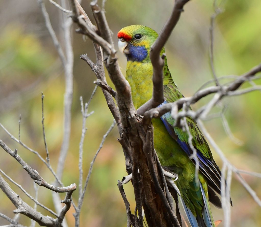 A little light rain started to fall and a Tasmanian Scrubwen was then sighted, and after coming to the intersection that heads back east(ish) towards the beach, we had glimpses of more distant scenic views, and then a better Green Rosella encounter.