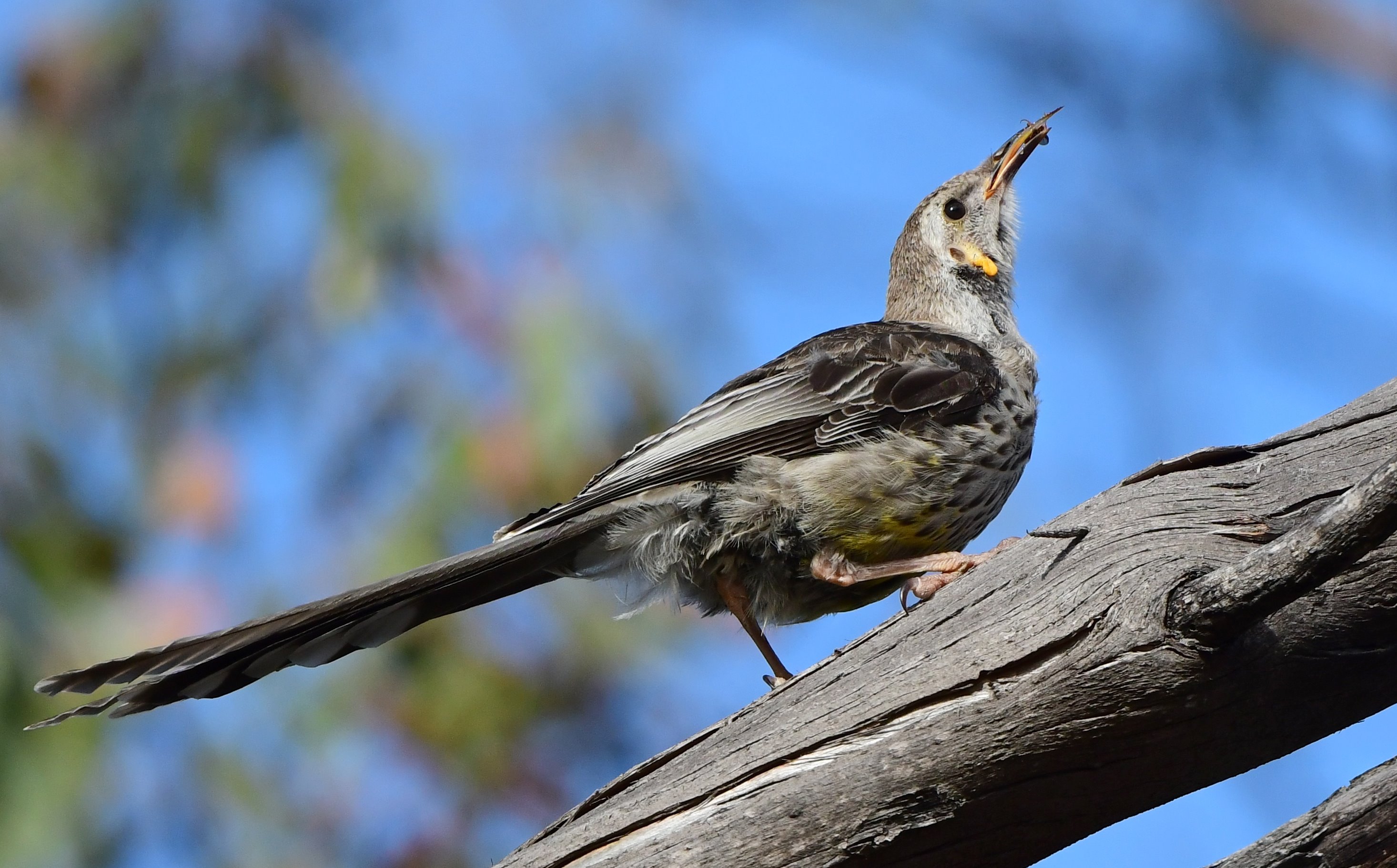A Blackbird or two added to the “introduced species” count, along with a few House Sparrows. Where were the native birds? A New Holland Honeyeater was the only one we could see. It would take a good 10 minutes or more to find Tasmanian Nativehen, then a further half hour for a Yellow Wattlebird to appear, clutching its morning insect prize.