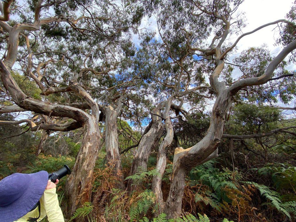 A Green Rosella was next up, looking very friendly as it posed for the keen photographers. The track had narrowed and the sand become softer, and we then came across an enormous White Gum. After a few moments of standing underneath it we realised the tree was full of birds – a pair of Flame Robins, for starters! After a couple of days birding in Tasmania we were now more adept at differentiating Scarlet from Flame Robins – the latter have red colouring on the throat up to the bottom of their bills.
