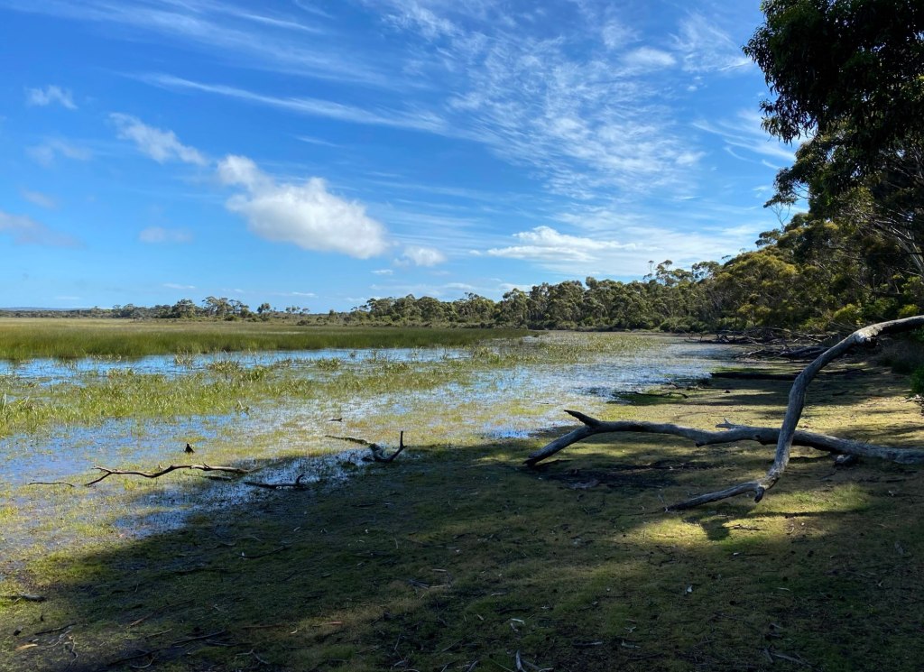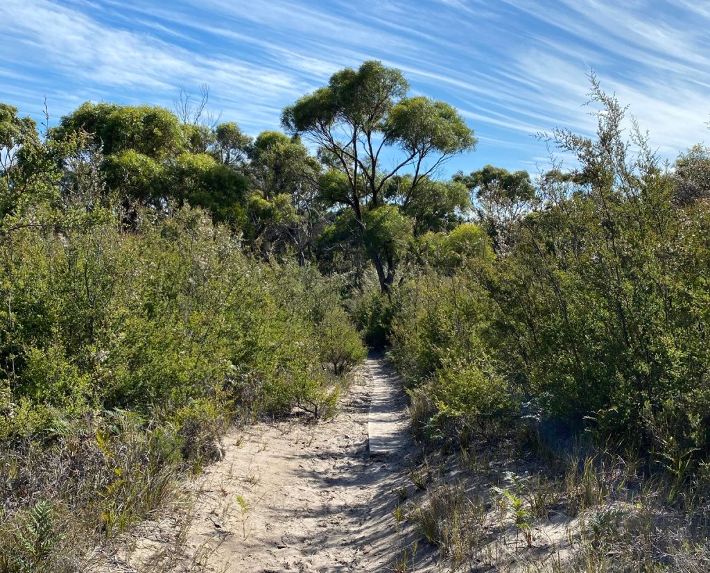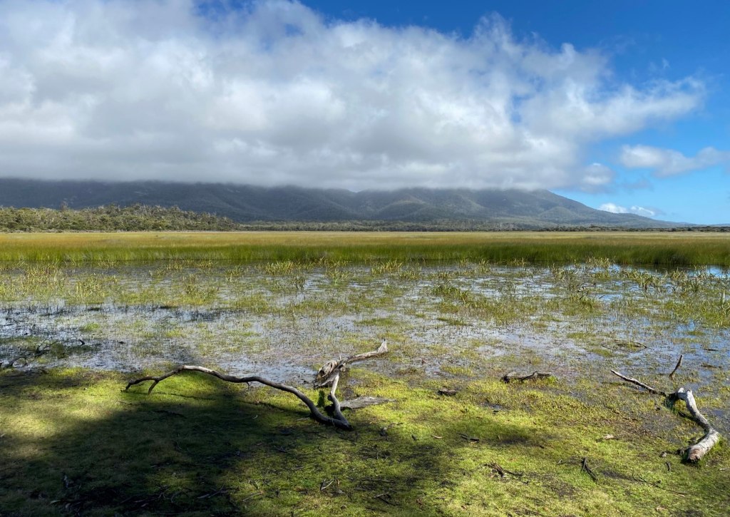 Some way along the isthmus track the swampy lowlands of Hazards Lagoon comes into view on the left.