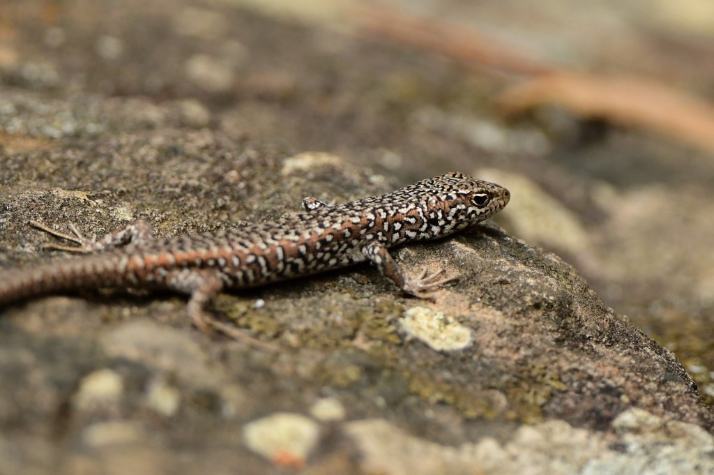 Upon starting our little loop walk, beginning with Bridge Walk (which crosses the suspension bridge to the western side of the river), we found a Spotted Skink sunning itself on the rocks. Lizards are a tad easier to photograph than birds…